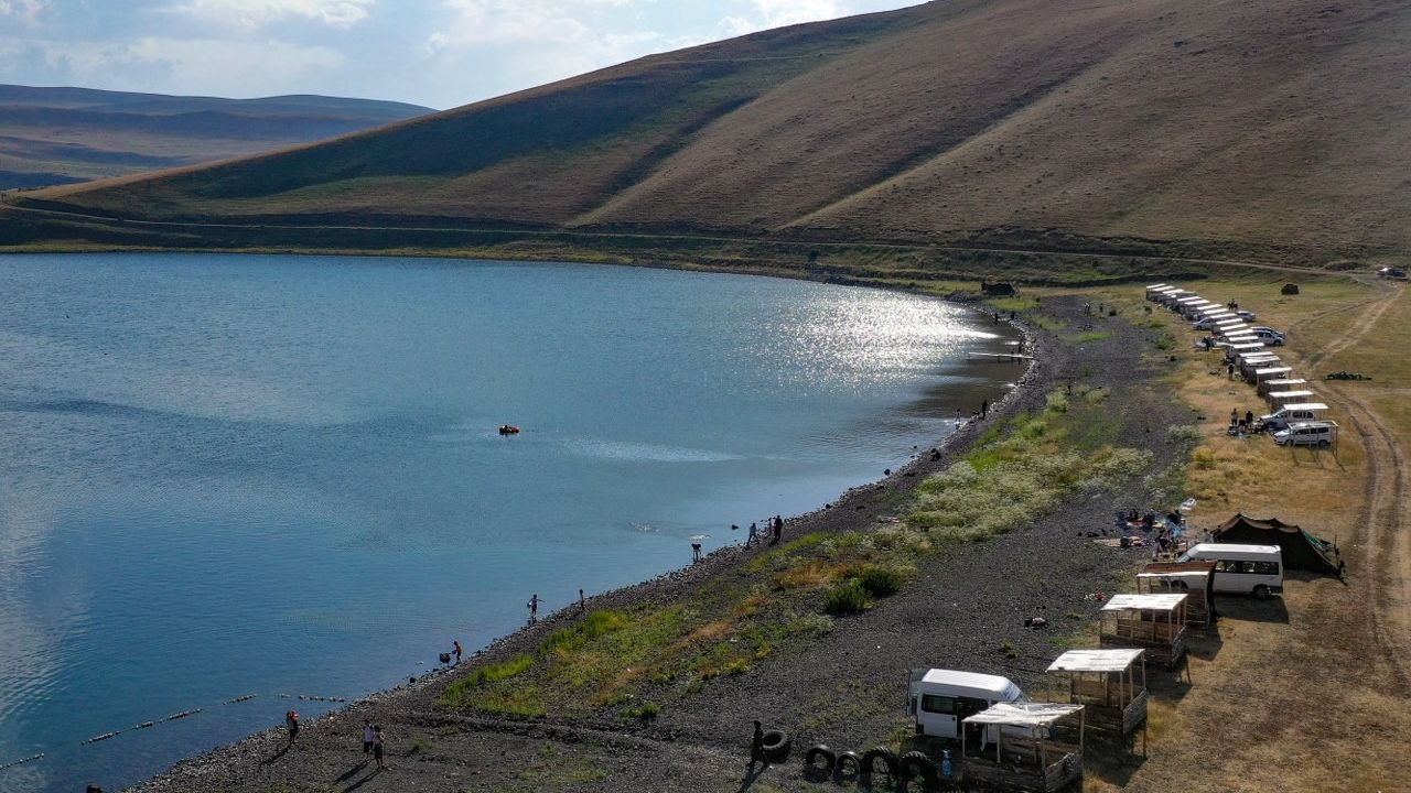 Ağrı’da 2 bin 241 metre rakımıyla Türkiye’nin en yüksek rakımlı göllerinden biri olan Balık Gölü, yurdu etkisi altına alan yüksek sıcaklıktan bunalan çevre illerdeki ailelerin kamp için ilk tercihleri arasında yer alıyor.