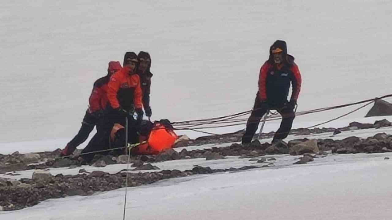 Ağrı Dağı’na yaptığı zirve tırmanışının ardından donarak hayatını kaybeden iki dağcının cesetleri zor şartlar altında 4 bin 200 rakımdaki kampa taşınıyor.