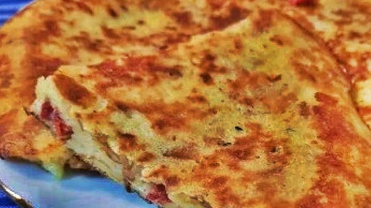 - Omletin bir tarafı piştikten sonra, bir tabak veya kapak yardımıyla dikkatlice ters çevirin.