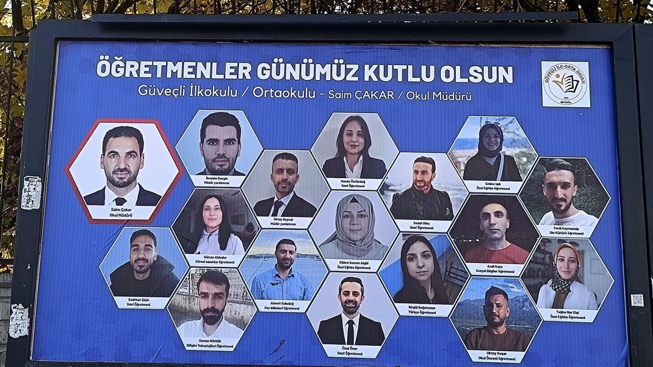 Bingöl’ün Güveçli İlkokulu Müdürü Saim Çakar, 24 Kasım Öğretmenler Günü‘nü okulundaki öğretmenler için farklı bir yöntemle kutladı. Öğretmenlerin isim ve fotoğraflarının yer aldığı bir afiş hazırlatarak, bu özel günü kent merkezindeki bir billboardda duyurdu. Afişte, “Öğretmenler Günümüz Kutlu Olsun” mesajı da yer aldı.