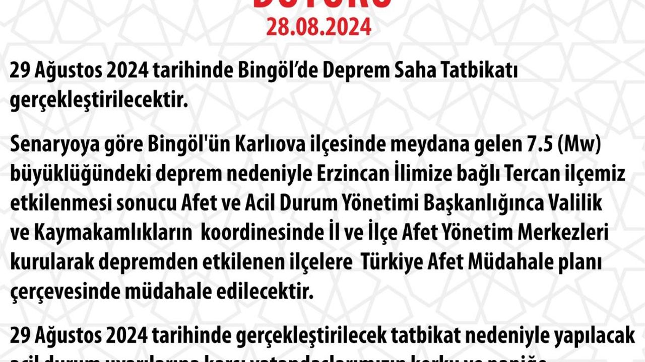 Afad Erzincan İl Müdürlüğü tarafından bir deprem tatbikatı gerçekleştirilecek. Tatbikata göre gece saatlerinde Birgöl’ün Karlıova ilçesi’nde bir deprem meydana gelecek. Erzincan bölgesinde de bu depremden Tercan ilçesi büyük yıkımlarla etkilenecek. Senaryoya göre 7.5 Mw şiddetinde olacak olan deprem tatbikatında Afetlerde davranış biçimlerinin belirlendiği esaslardoğrultusunda saha ekibi oluşturulacak.