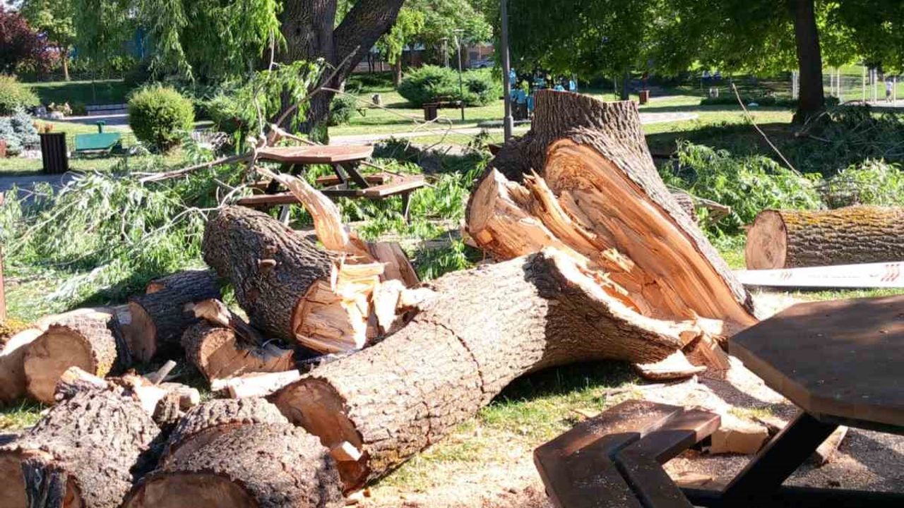 ESKİŞEHİR’DE BİR PARKTA SÖĞÜT AĞACININ DEVRİLMESİ NEDENİYLE TEDİRGİN OLAN MAHALLELİNİN YAPTIĞI ÇAĞRI SONRASINDA DEVRİLEN AĞACI TAMAMEN KESERKEN ODUNPAZARI BELEDİYESİ EKİPLERİ…