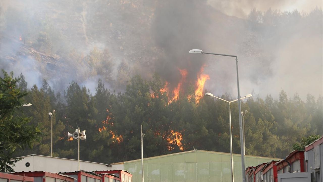 GÖRÜNTÜ DÖKÜMÜ : – Geçici Barınma Merkezi yakınındaki ormanlık alandan yükselen alevler – Geçici Barınma Merkezinde yanan konteyner ve çalılık…