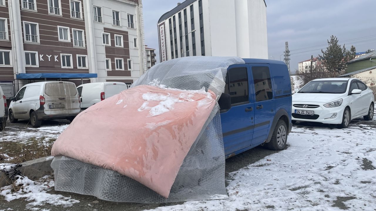Çatılarda buz sarkıtlarının oluştuğu kentte, bazı vatandaşlar araçlarının üzerine yorgan, branda ve battaniye örterek soğuktan korumaya çalıştı.