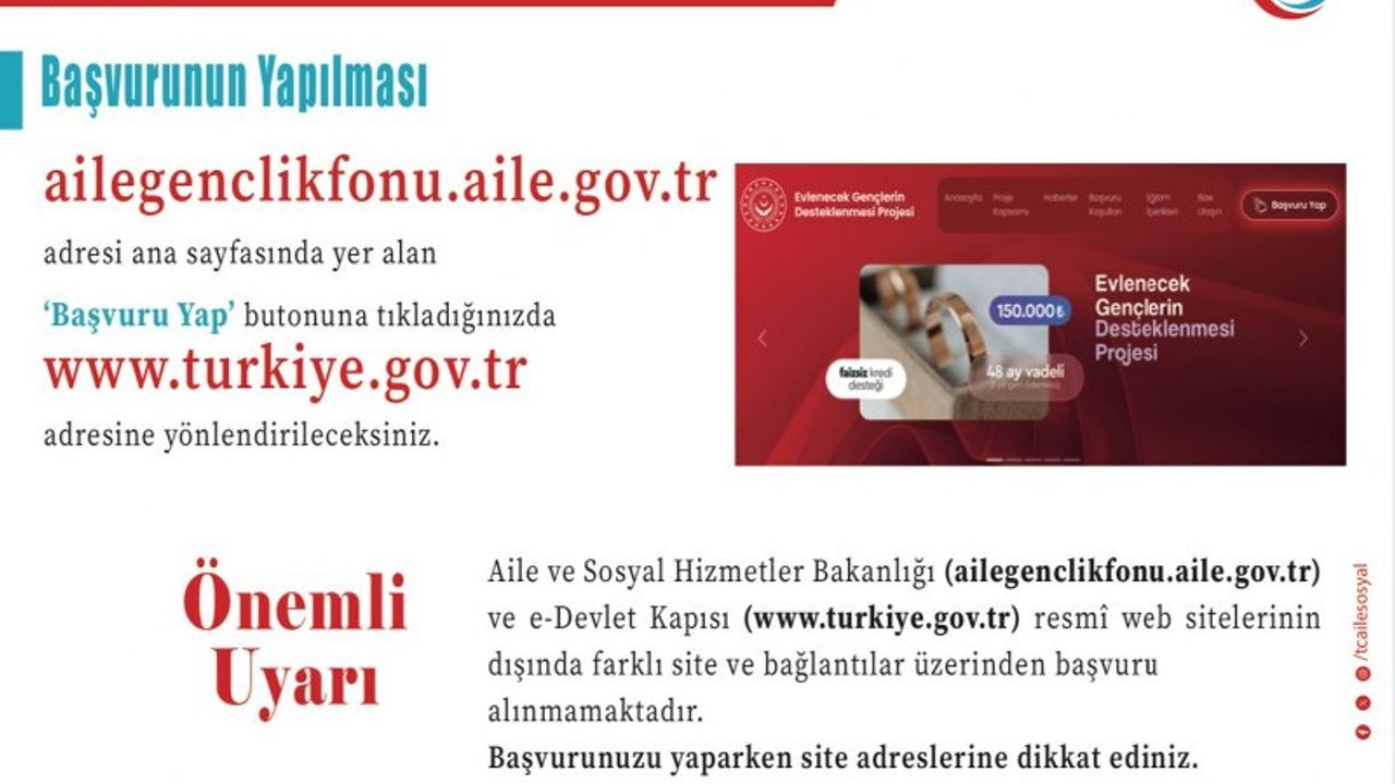 Bakanlık tarafından yapılan açıklamada, evlilik kredisi başvurusu veya ödeme aşamasında herhangi bir ücret talep edilmediği belirtilirken, vatandaşların kişisel bilgilerini korumaları konusunda uyarıda bulunuldu.
