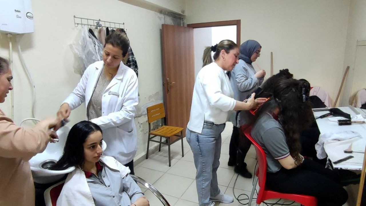 Saç bakımı yapan kursiyerler bayram öncesi öğrencileri sevindirmenin hem de mesleklerini geliştirmenin mutluluğunu yaşadı.