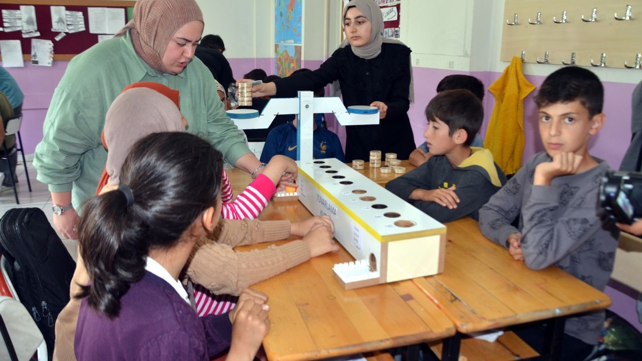 MUŞ (AA) – Muş Alparslan Üniversitesinde eğitim gören öğretmen adayları, matematiği sevdirmek amacıyla tasarladıkları materyalleri gittikleri okullarda öğrencilere tanıttı.