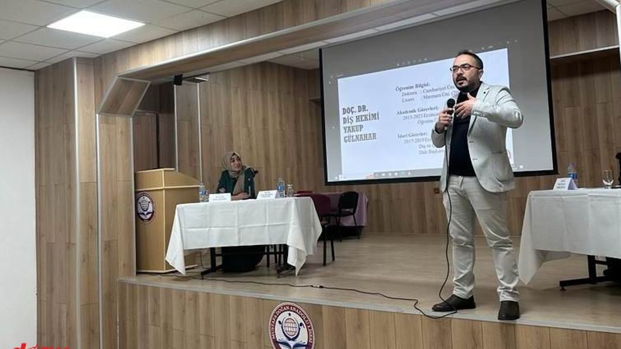 Üniversite sınavına hazırlanan öğrencilere yönelik düzenlenen seminerde Diş Hekimliği meslek kazanımlarını anlatıldı, öğrenciler merak ettiklerini öğrendi. Erzincan Mustafa Doğan Anadolu Lisesi tarafından düzenlenen Meslek Tanıtım Seminerinin konuğu Erzincan Binali Yıldırım Üniversitesi Diş Hekimliği Fakültesi Ağız ve Çene Cerrahisi Bölümü Öğretim Üyesi Doç. Dr. Yakup Gülnahar oldu. Gülnahar seminerde deneyimlerini ve kazanımlarını öğrencilerle paylaştı.
