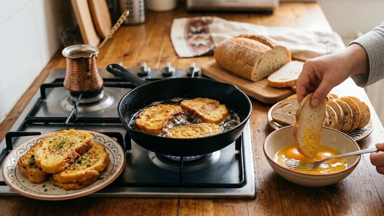Hazırlanışı: Geniş bir kasede yumurtaları tuzla birlikte iyice çırpın. Dilimlediğiniz bayat ekmekleri bu karışıma arkalı önlü batırarak yumurtayı iyice çekmesini sağlayın. Tavada kızdırdığınız az miktarda sıvı yağda, ekmeklerin her iki yüzü de altın sarısı renk alana kadar kızartın.