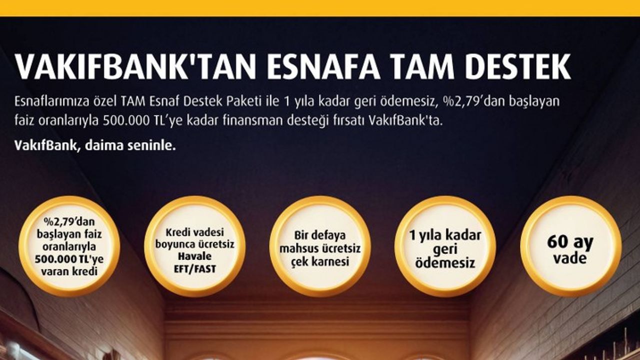 VakıfBank, esnafa özel TAM Esnaf Destek Paketi ile %2,79’dan başlayan faiz oranları ve 1 yıla kadar geri ödemesiz kredi imkanı…