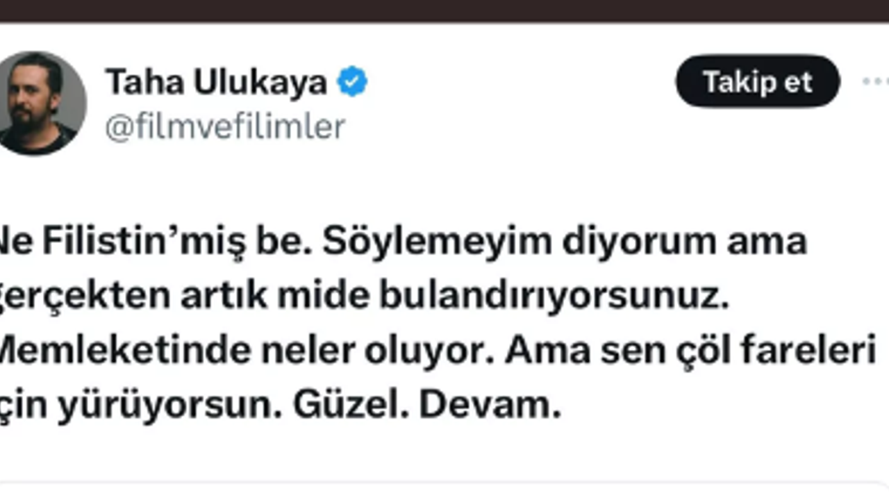 Sanatçı bir kişilik, kendini bilmez bir vatandaş Taha Ulukaya. Bu şahıs, İsrail'de ki zulmü telin için yürüyenlere hitaben "Sen çöl…