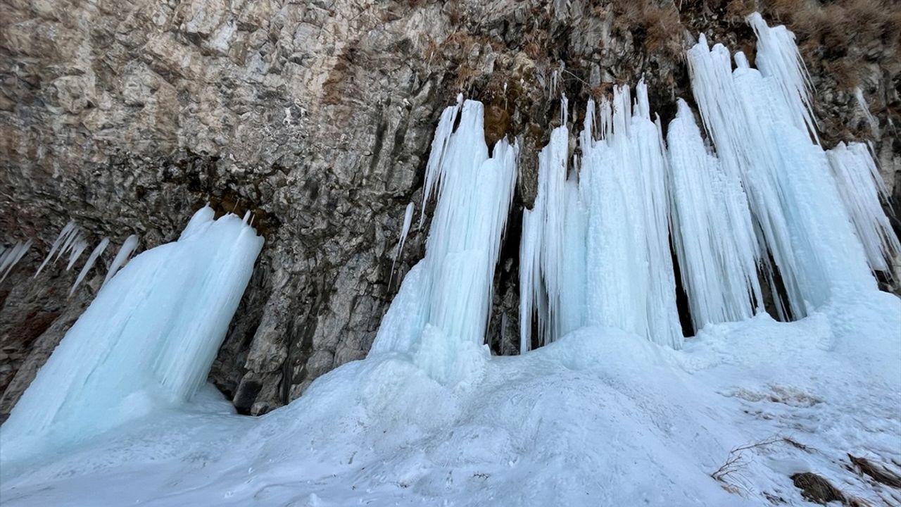 Ağrı'nın Diyadin ilçesindeki Murat Kanyonu, soğuk hava nedeniyle oluşan metrelerce uzunluktaki buz sarkıtlarıyla büyüleyici bir kış manzarası sunuyor.