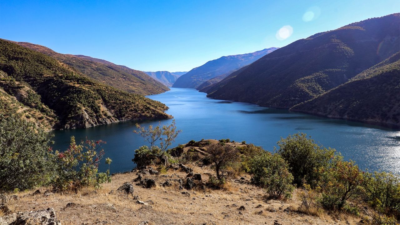 Elazığ, Diyarbakır ve Malatya’nın sınırının kesiştiği noktadaki baraj gölü manzarası dronla görüntülendi