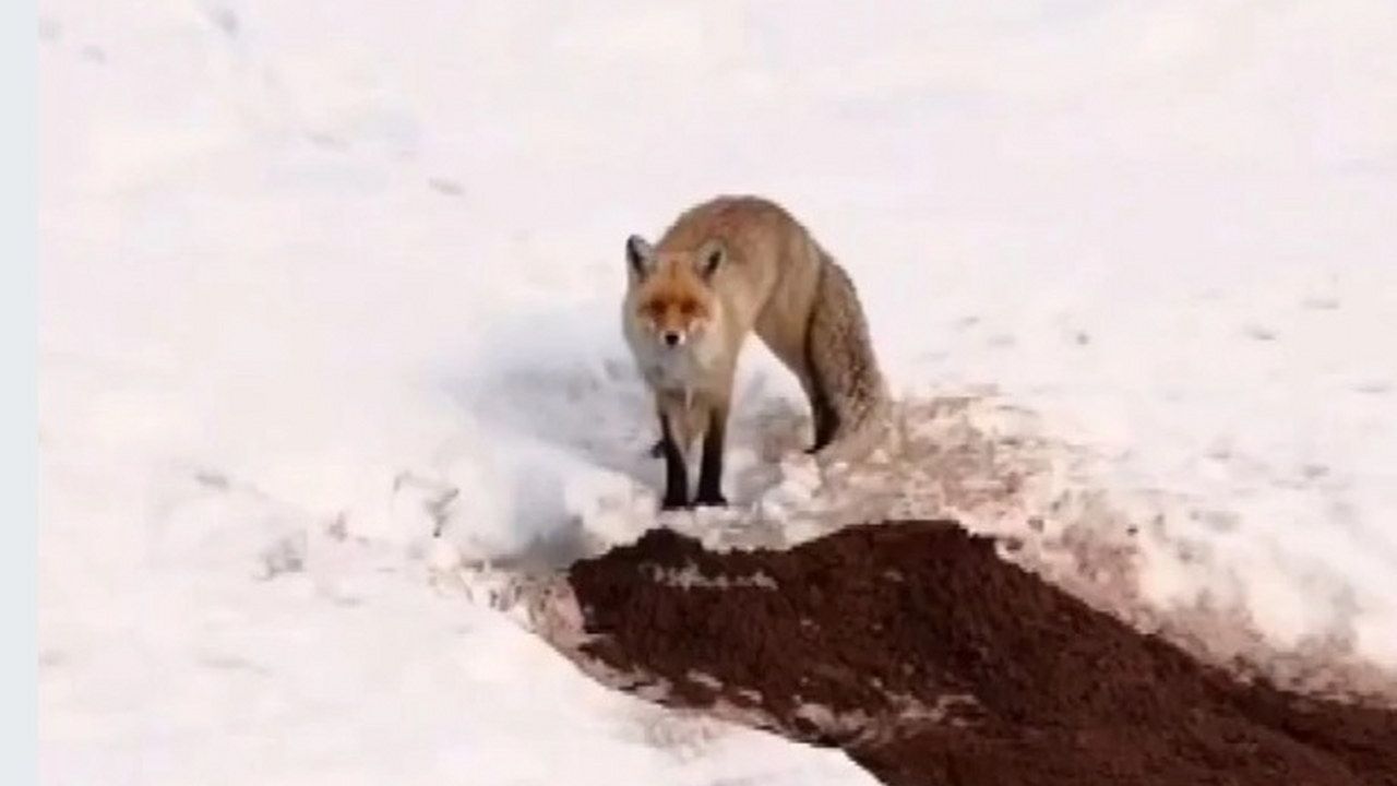 Erzincan’da karlı arazide bir tilki, yuvasından çıkarken drone ile havadan görüntülendi.