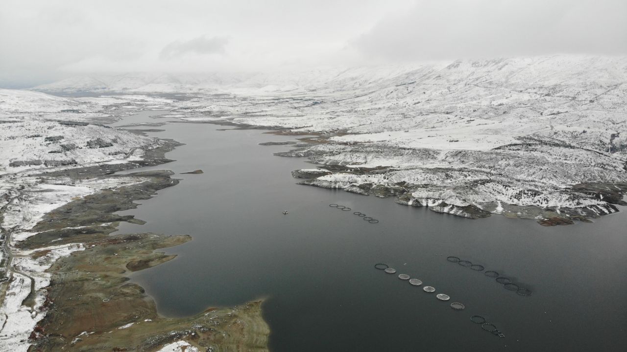 Malatya’da karla kaplanan Sürgü Barajı dronla görüntülendi