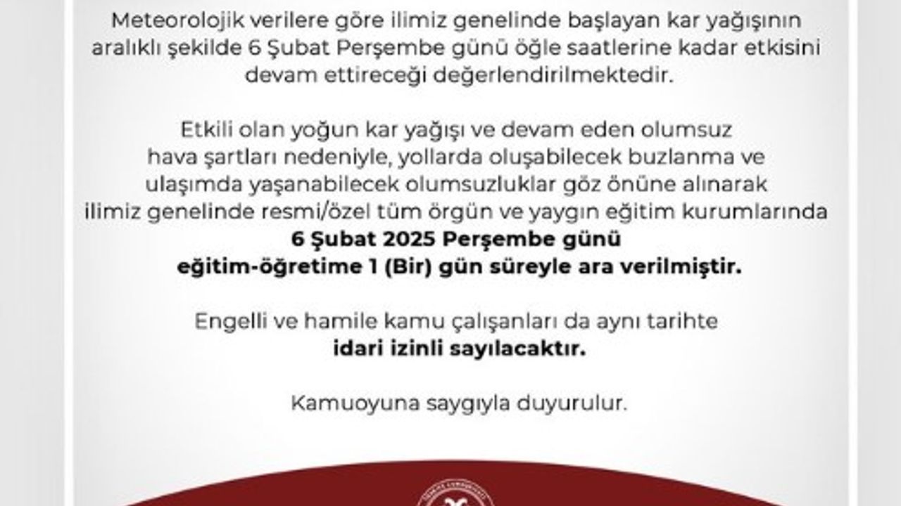 Erzincan'da yoğun kar yağışı nedeniyle 6 Şubat Perşembe günü okullar tatil edildi. Vali Aydoğdu, öğrencilere "sevdiklerinizle güzel anılar biriktirin" çağrısı…