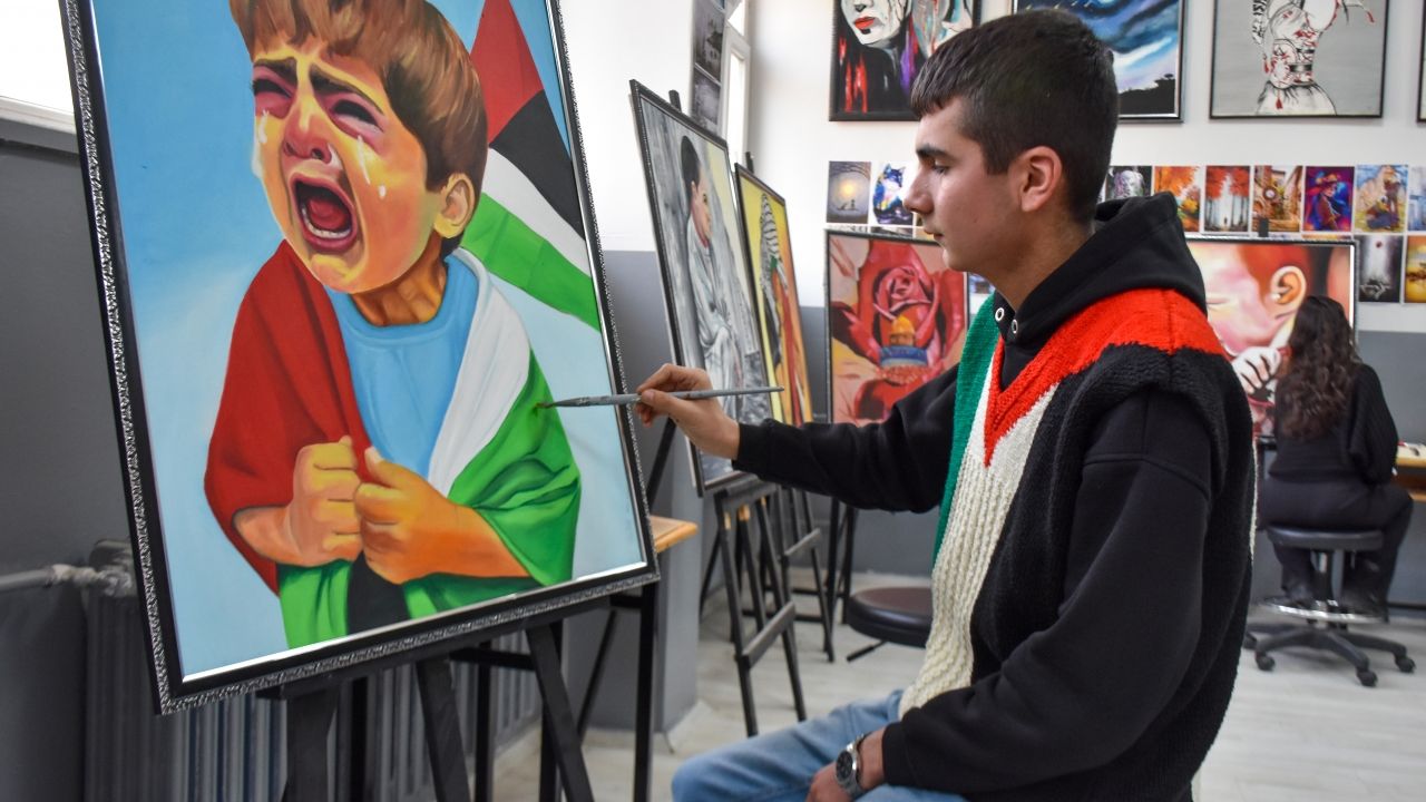 Van'da Atatürk Anadolu Lisesi öğrencileri, Gazze'deki insani kriz hakkında toplumsal farkındalık oluşturmak için resim yaparak, Filistin halkının acılarını tuvallere yansıtıyor.