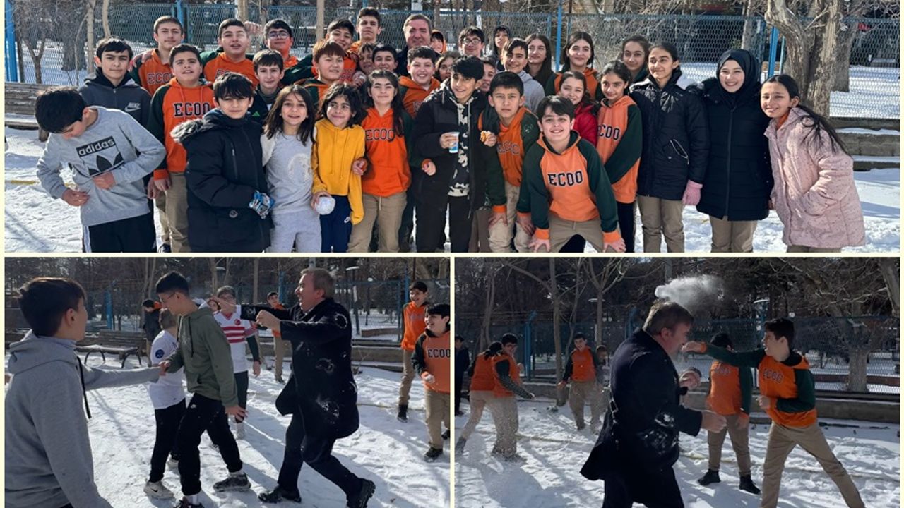 Cumhuriyet Ortaokulunda öğrencilerle birlikte kartopu oynayıp, okul bahçesinde renkli anlara imza attı.