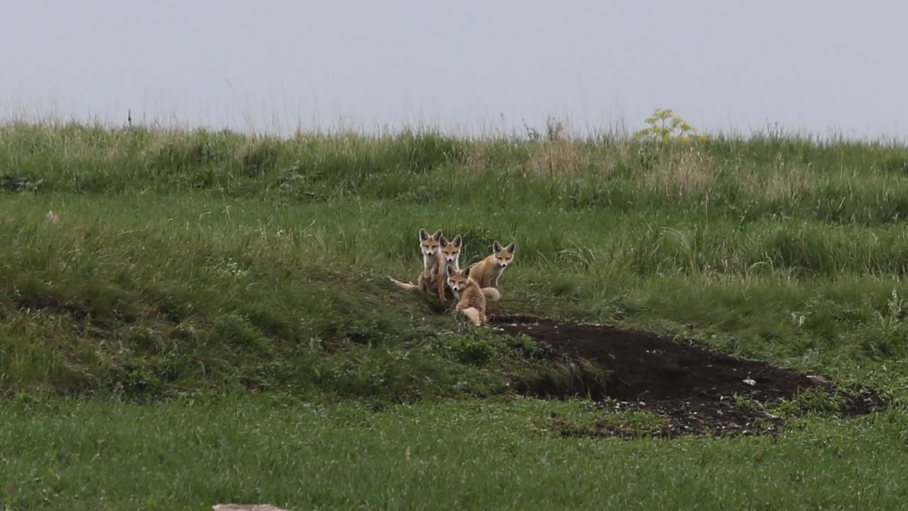Kars’ta yuvalarından çıkan tilki ailesi yavrularıyla görüntülendi