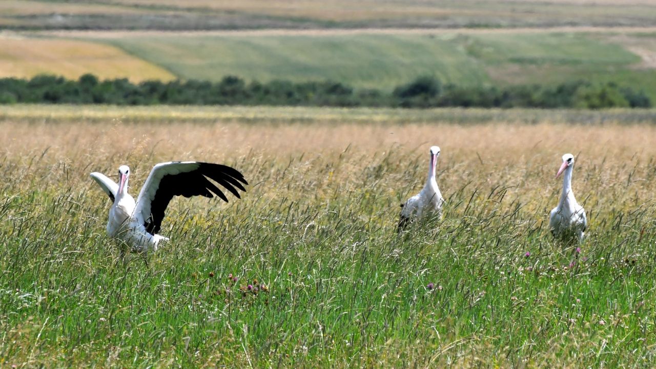 Kars’ta leylekler çayırlarda beslenirken görüntülendi