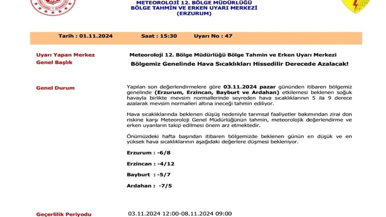 Meteoroloji 12. Bölge Müdürlüğü Bölge Tahmin ve Erken Uyarı Merkezinden Erzincan için uyarı geldi.