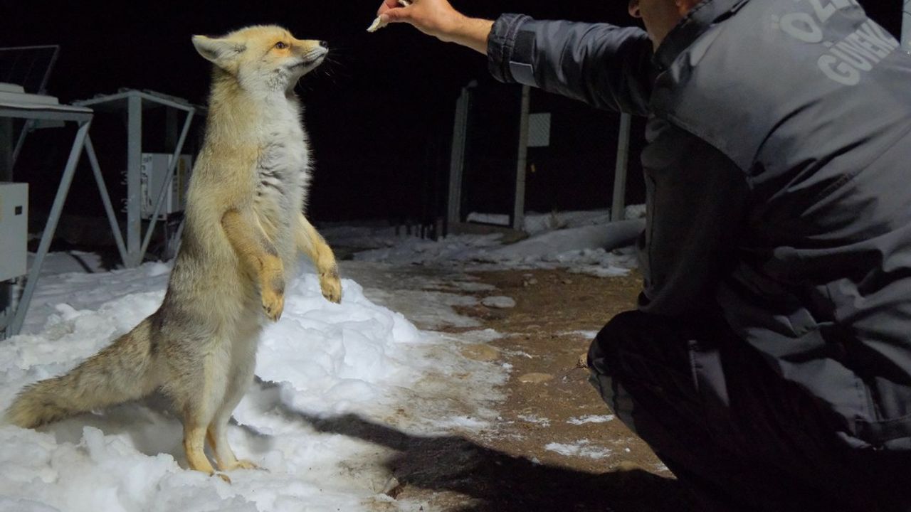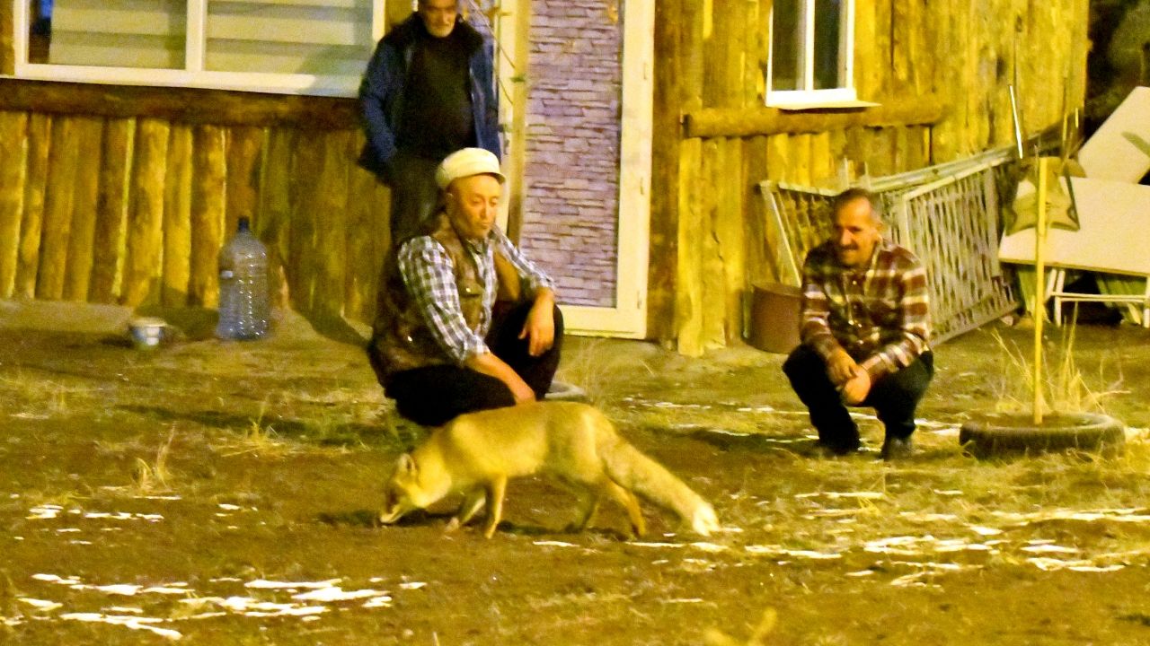 Kars’ın Sarıkamış ilçesinde aç kalan kızıl tilkiyi bölge sakinleri besledi