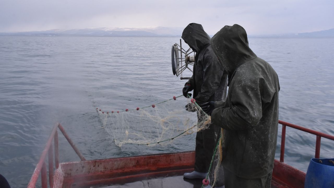 Van Gölü'nde balıkçılar, dondurucu soğukta ve zorlu hava koşullarında kış aylarında da geçimlerini sağlamak için ağlarını topluyor ve avlanma faaliyetlerine…