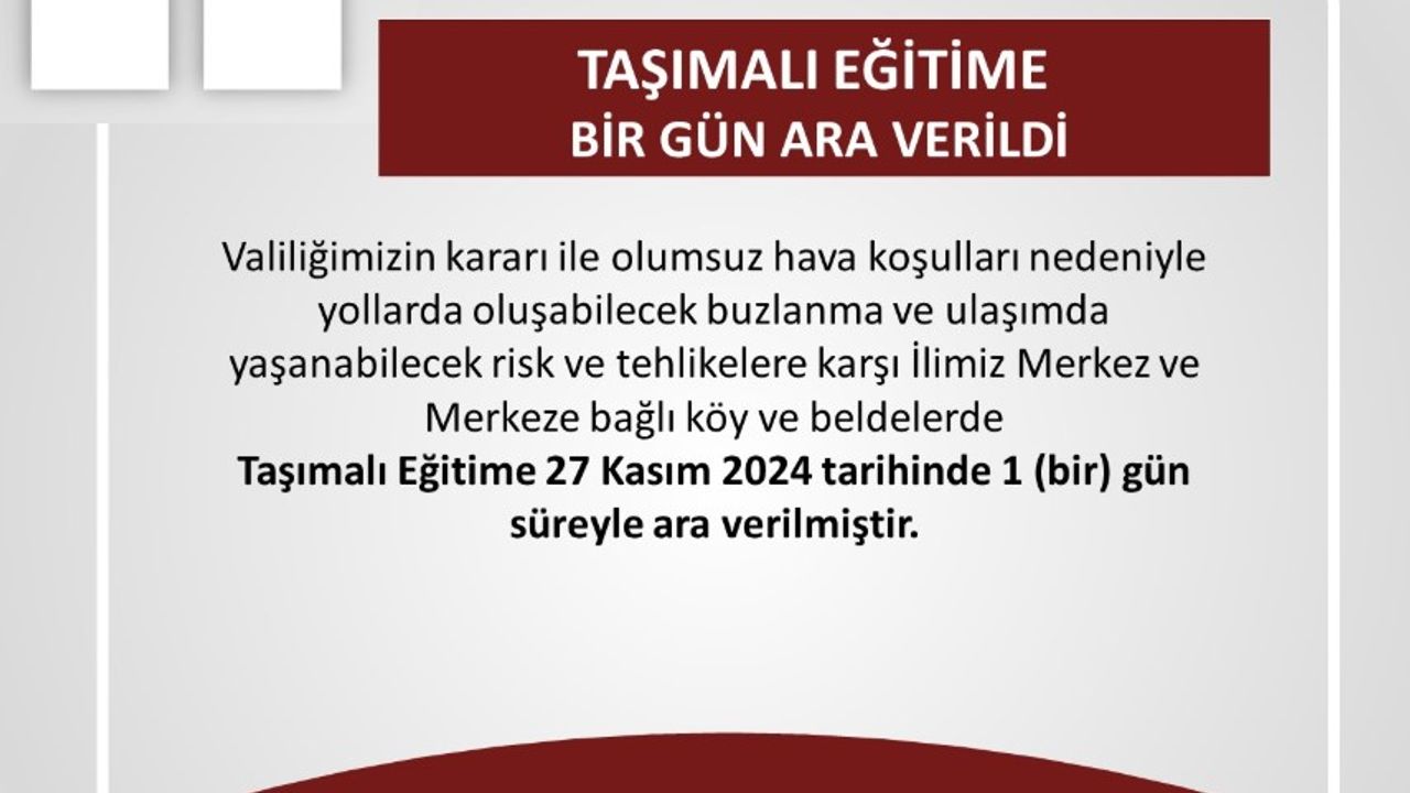 Erzincan Valiliği, çetin kış şartları sebebiyle yaşanabilecek olumsuzlukların önüne geçmek adına taşımalı eğitim gören öğrencilere 1 günlük ekstra tatil ilan etti. Yapılan Valilik ve Milli Eğitim Müdürlüğü bilgilendirmesine göre 27 Kasım 2024 Çarşamba günü de taşımalı eğitim gören öğrenciler için tatil.
