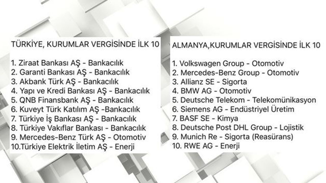 Öte yandan Almanya’da ise durum tam tersi. Almanya’da en çok kurumlar vergisi ödeyen şirketlerin başında otomotiv ve sanayi şirketleri geliyor. Bu durum, Alman ekonomisinin güçlü sanayi temellerine sahip olduğunu ve ülke ekonomisinin lokomotifinin sanayi olduğunu gösteriyor.